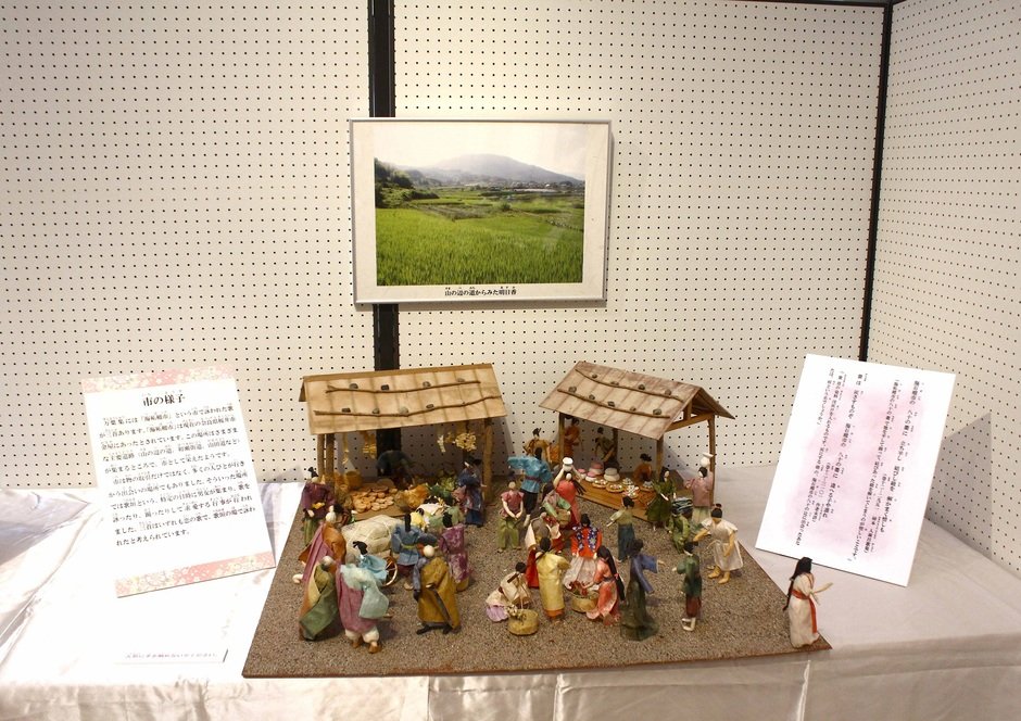 奈良時代の都の様子や国府町にまつわる伝承などを題材に、和紙人形の作品を展示し、パネルにて解説しています。