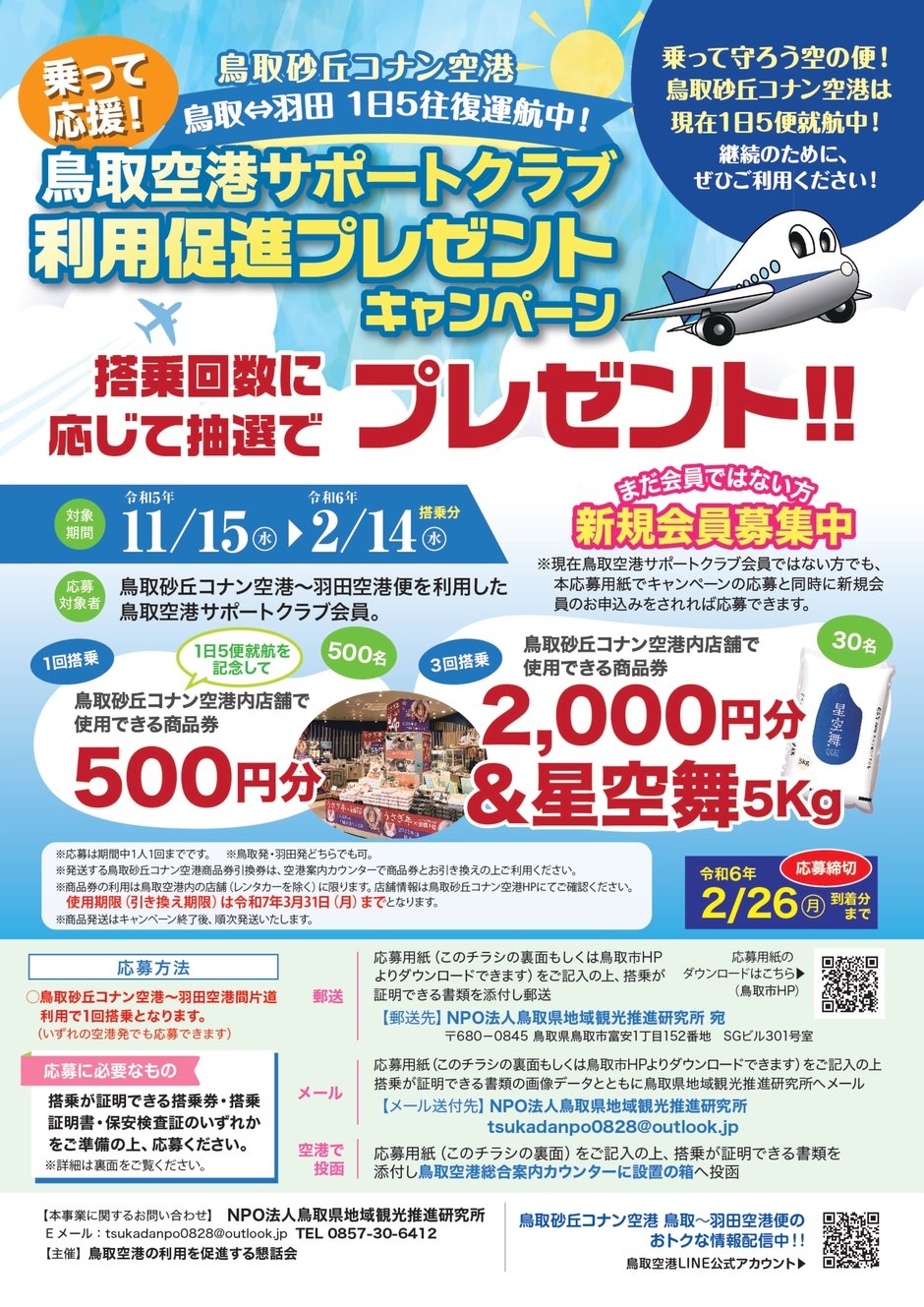 ※現在鳥取空港サポートクラブ会員ではない方でも、本キャンペーンの応募と同時に新規会員のお申込みをされれば応募ができます