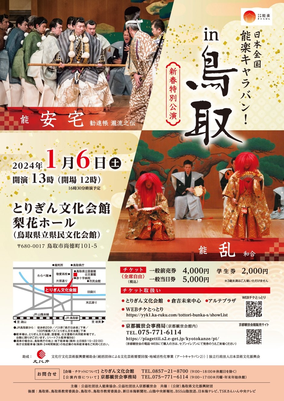 | お問い合わせ | 【チケットに関すること】 とりぎん文化会館(鳥取県立県民文化会館) TEL:0857-21-8700(9:00~18:00)※休館日を除く 【公演に関すること】 京都観世会事務局 TEL:075-771-6114(9:00~17:00)※月曜日、年末年始を除く |