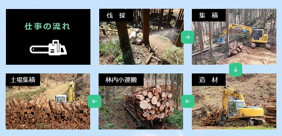 間伐・皆伐作業から長期森林管理、各事業の相談など幅広い作業に対応しています。