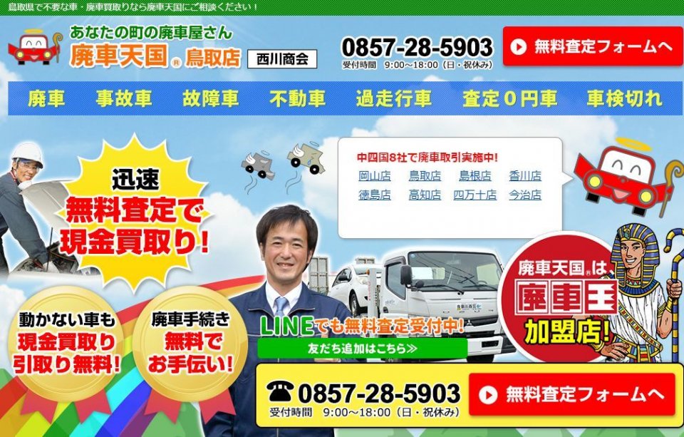 米子にあるテクニカルクリーンさまが運営するカーハピネスも廃車買取可能です多走行、低年式、故障車、不動車、もちろん優良中古車も、無料査定でどんな車も買取可能