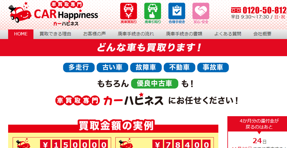廃車はもちろん、事故車、動かない車、過走行、車検切れのクルマもすべて対応してくれます。