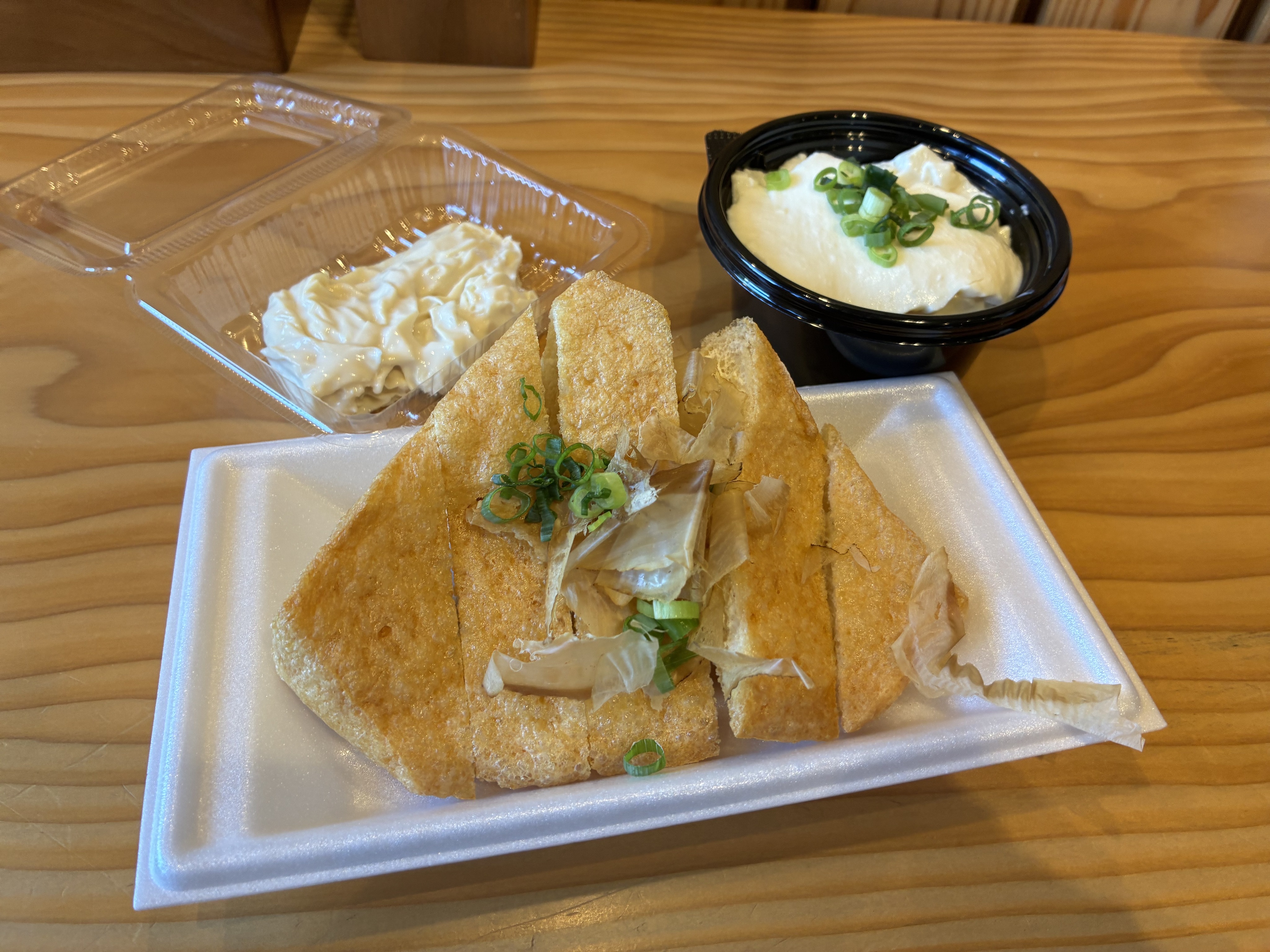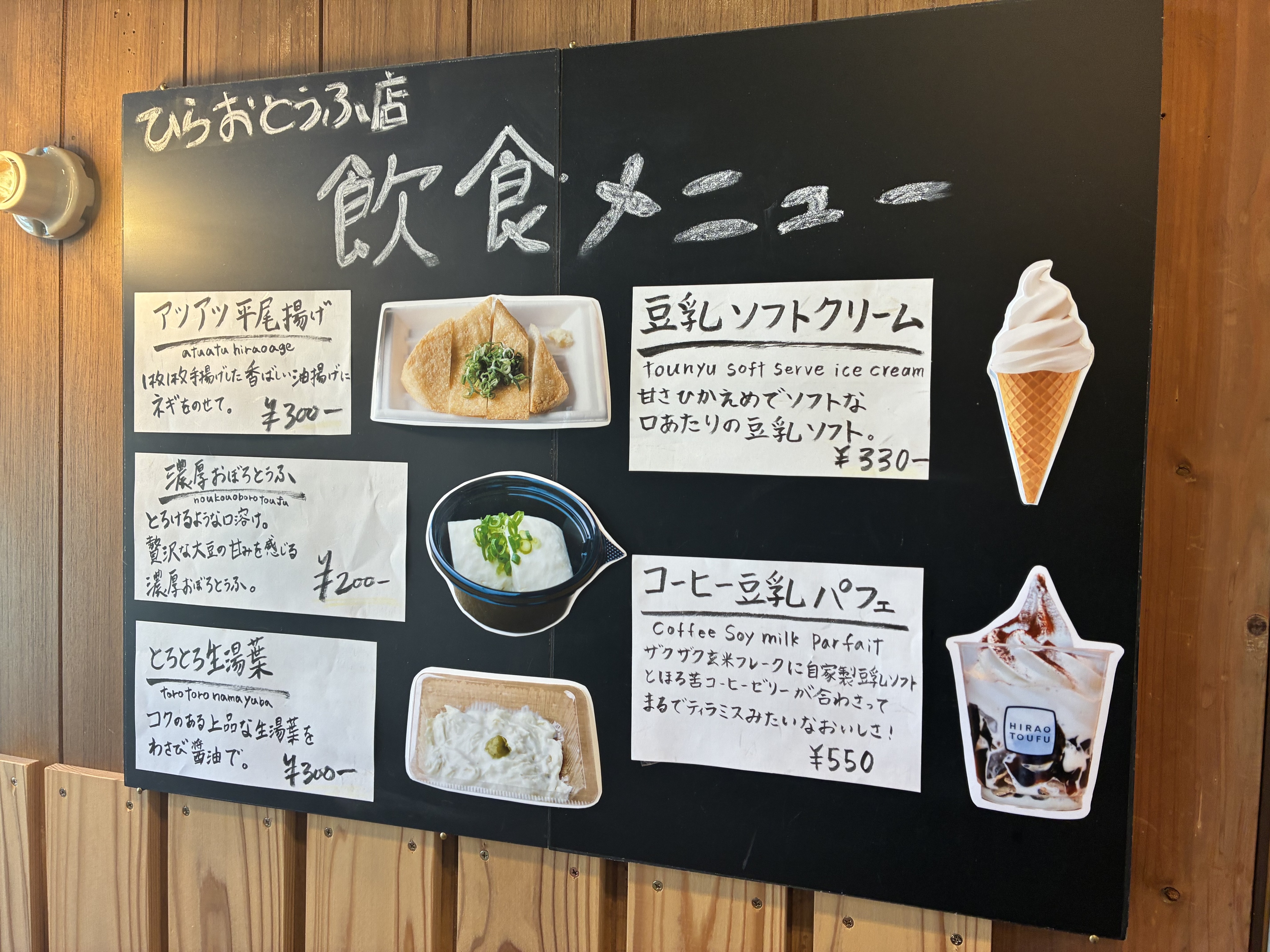 テイクアウトがメインのお店ですが、店内には3席ほどのイートインスペースもあり、今回はそちらを利用。どれも気になるラインナップの中から、揚げたてのアツアツ平尾揚げ(300円)、豆乳ソフトクリーム(330円)、濃厚おぼろどうふ(200円)、とろとろ生湯葉(300円)をいただきました。