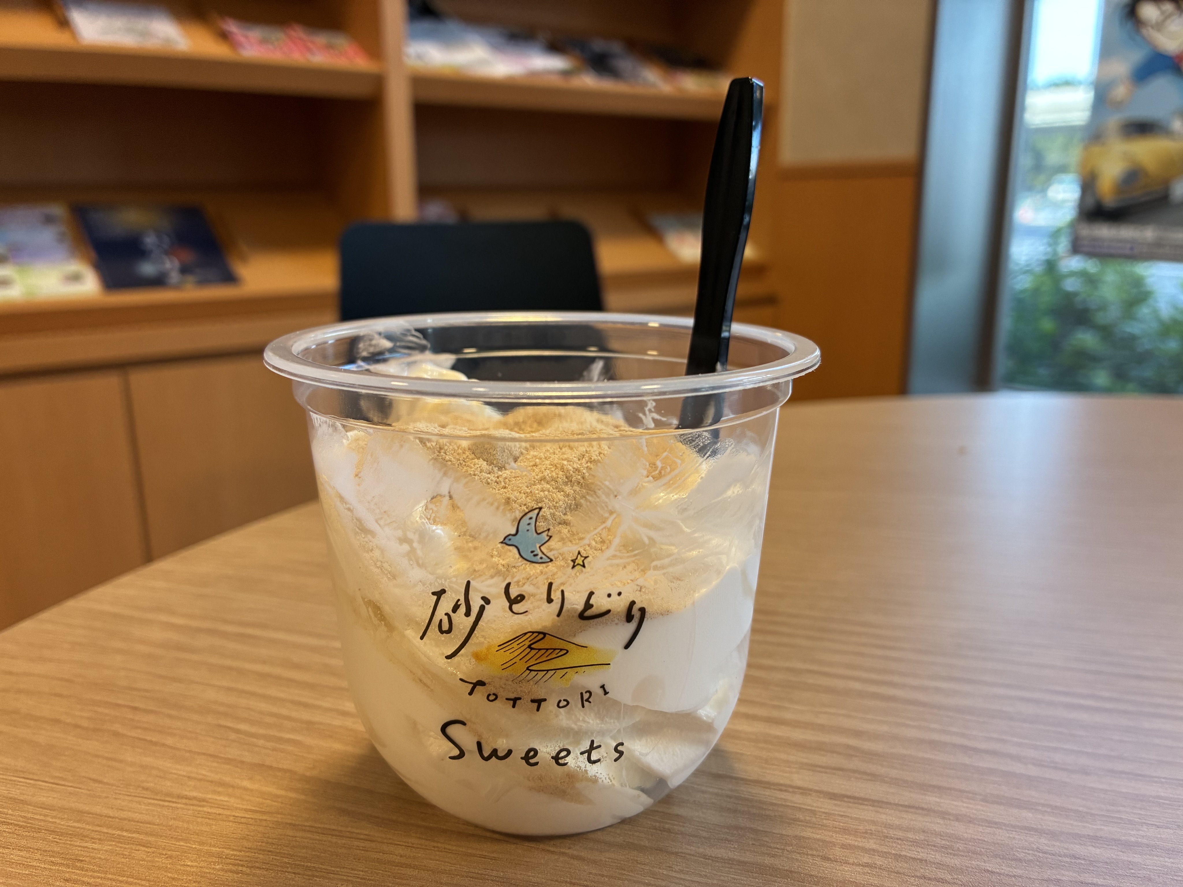 “のびる”と話題の「ねばりっこソフト」は、鳥取の名産「砂丘長芋(ねばりっこ)」を使用した、粘りとコクのあるオリジナルソフトクリーム。実際に食べてみると、思っていたより「ビヨーン!」とは伸びませんでしたが(笑)、たしかに粘り気はあります。ずっしりと重めで、スプーンですくうと少し抵抗を感じるほどのもっちり感。